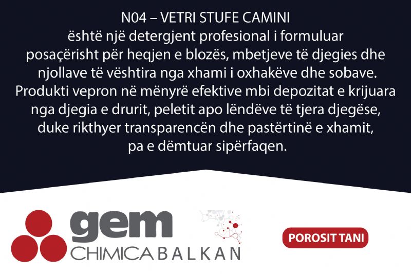Detergjent per xhama oxhaku dhe sobe N04 – VETRI STUFE CAMINI nga Gem Chimica Balkan, pastrues per xham oxhaku, detergjent per heqjen e blozes, pastrues per xhama sobash, produkt per pastrim xhami oxhaku, detergjent per mbetje djegieje